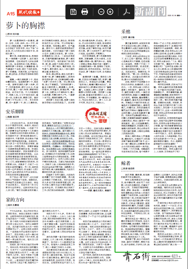 动漫A片 本科生杨佳炜的文章《鲸者》,通过第一视角的方式,以鲸的口吻表达了对人类无情杀戮,并破坏大自然生态平衡行为的控诉。文章在现代快报2020年10月19日这一期正式刊发。