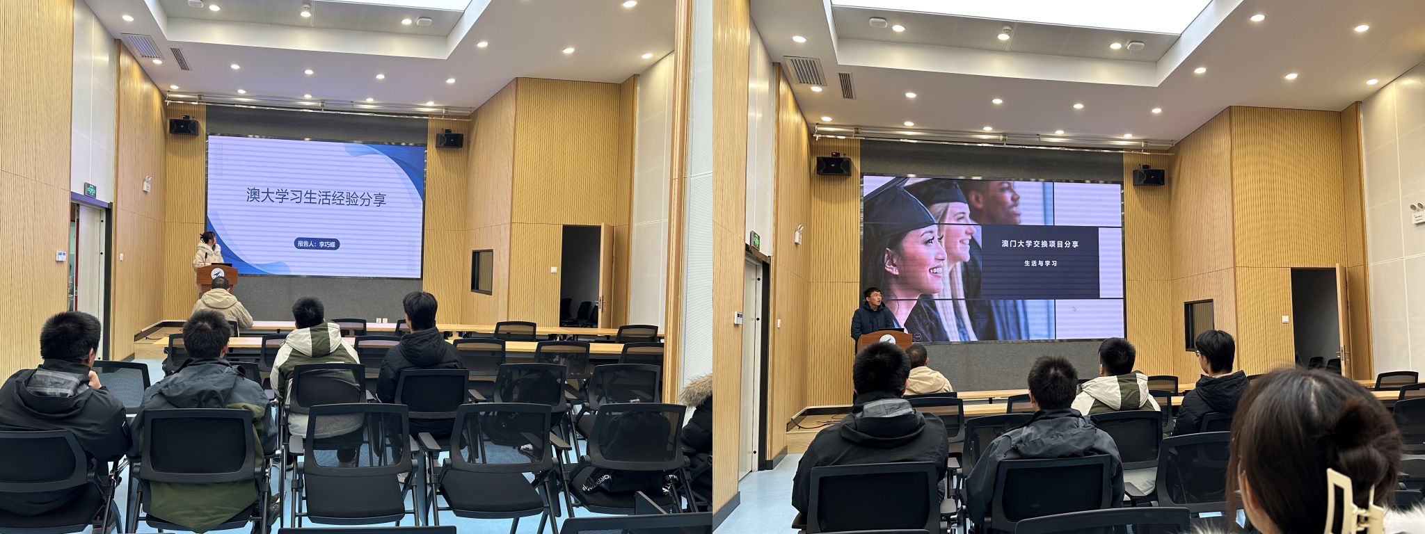 随后,2021级本科生李巧蝶和严文强同学作为上期交换生进行了经验分享。两位同学对在澳门大学的学习和生活,以及个人成长与收获进行了全面生动地介绍和总结,同时感谢学校和学院提供这次宝贵的交流机会,并鼓励同学们积极申请。