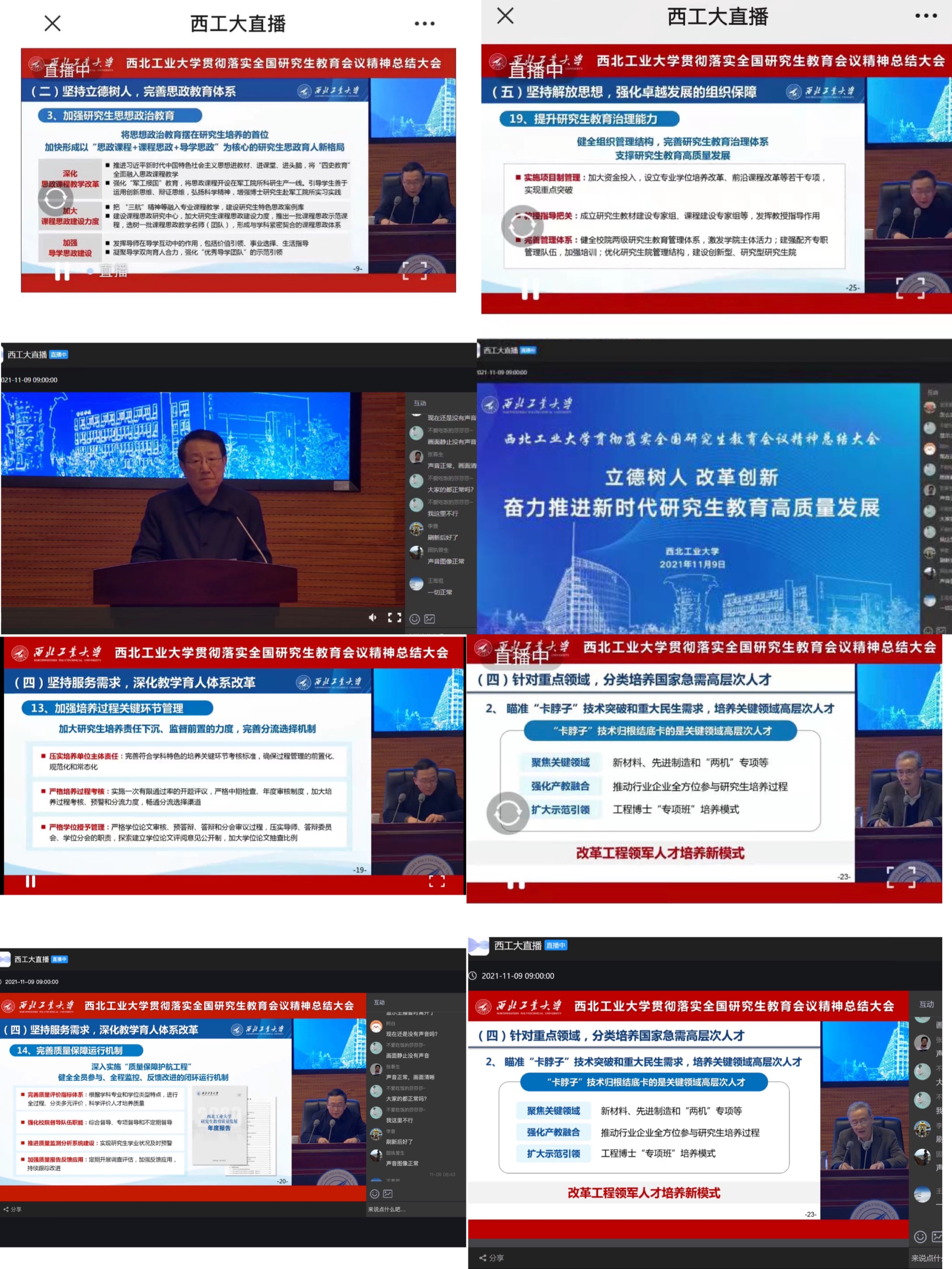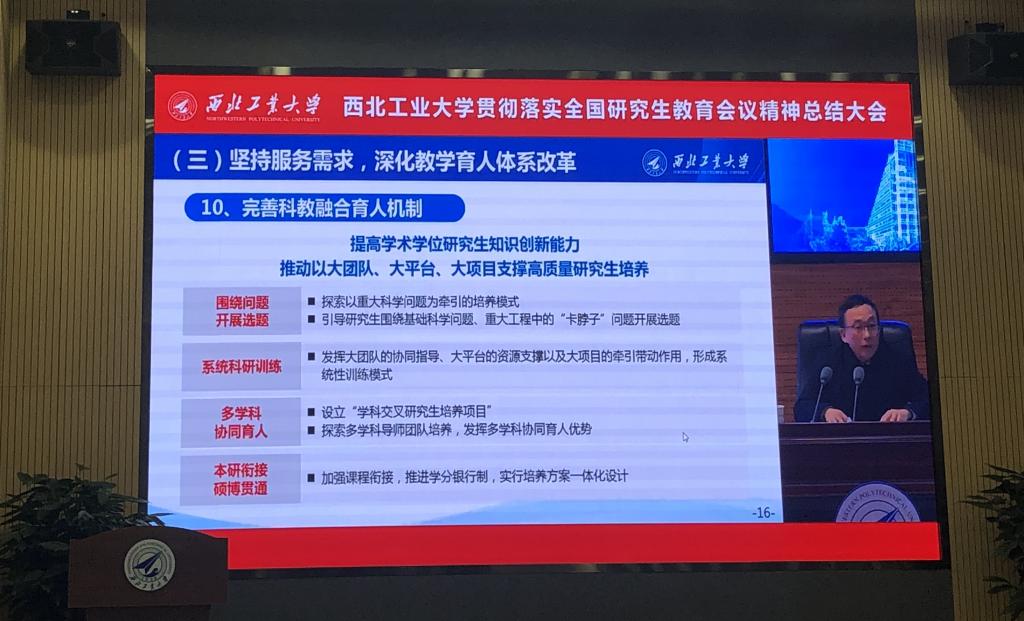 会上,汪劲松校长作《立德树人 改革创新 奋力推进新时代研究生教育高质量发展》主题报告,从准确把握新时代研究生教育的时代使命和目标、明确西工大研究生教育高质量发展的核心任务、推进西工大研究生教育发展再上新台阶三个方面发表讲话。汪劲松强调,研究生教育高质量发展的核心任务是:深化思想政治教育,落实立德树人根本任务;不断优化学科布局,建设特色学科生态体系;加强导师队伍建设,落实教书育人职责;针对重点领域,分类培养高层次人才;强化质量保障体系建设,树立研究生教育质量观。会议要求相关责任单位要提高政治站位、强化责任落实、加强政策宣贯、扎实取得实效。值得一提的是,会议上还特别表扬了学院王文老师在高水平科研引领研究生培养方面的优秀典型案例。