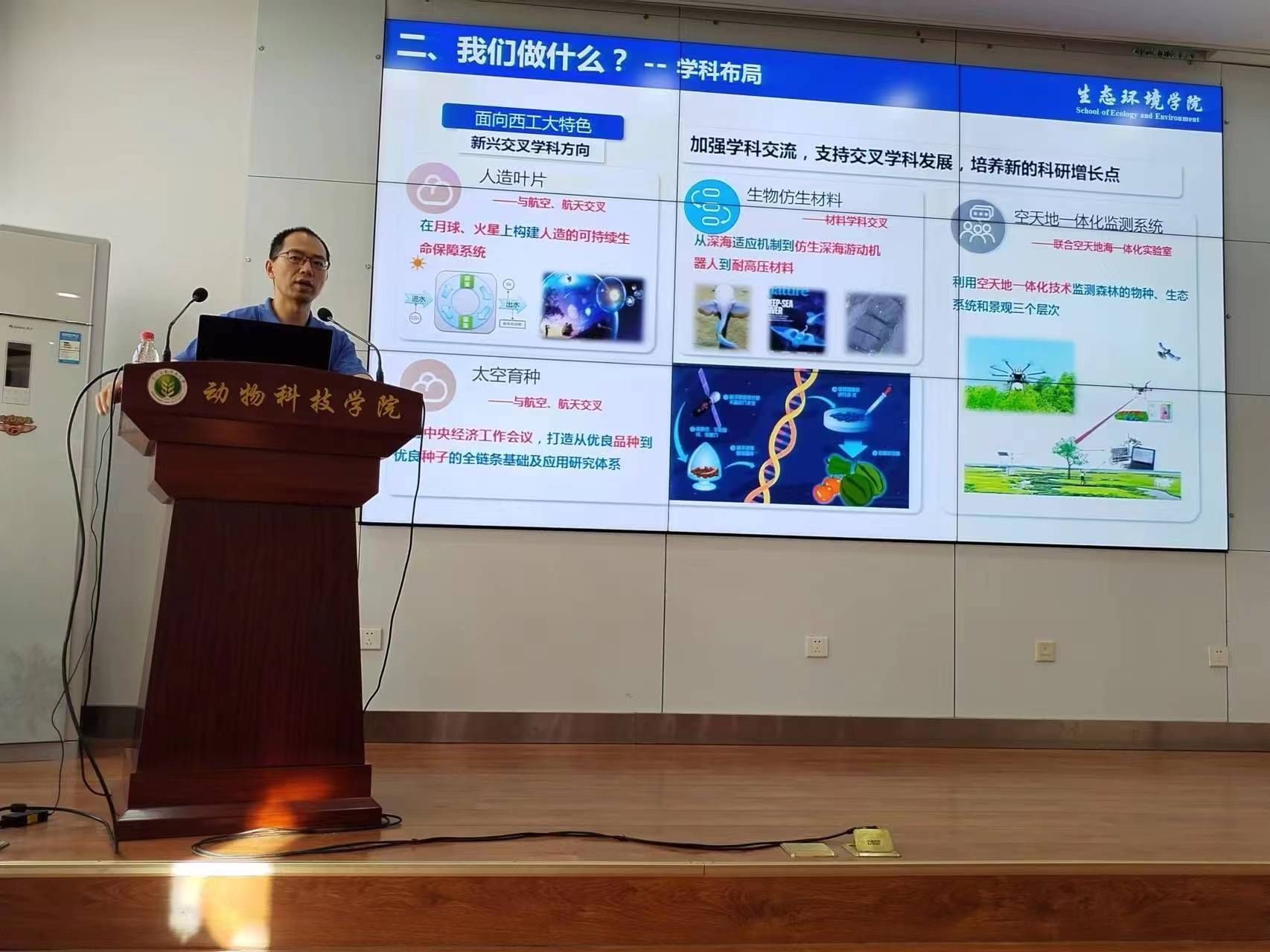 蔡晶、张文宇到达西北农林科技大学。蔡晶介绍了学校的整体情况,学院的学科布局、专业特色及就业前景。随后,蔡晶、张文宇分别介绍了各自的研究方向,通过对动植物生态学最新研究进展的介绍,强调了生态学学科对发展社会主义生态文明建设的重要性,勉励同学们努力学习,为国家发展贡献力量。