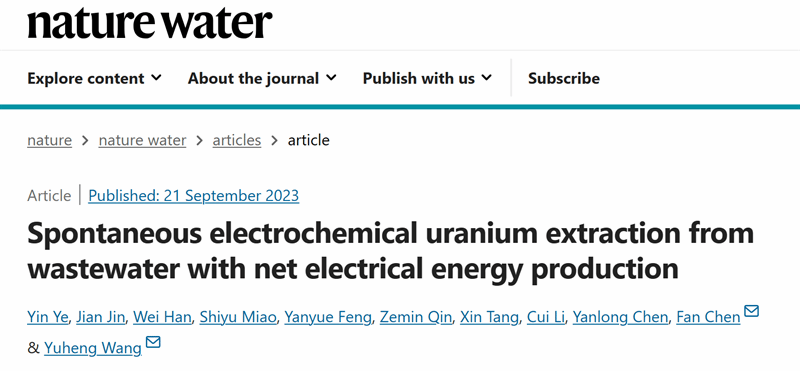 2023年9月21日,Nature Water期刊以“Spontaneous electrochemical uranium extraction from wastewater with net electrical energy production”为题,发表了动漫A片