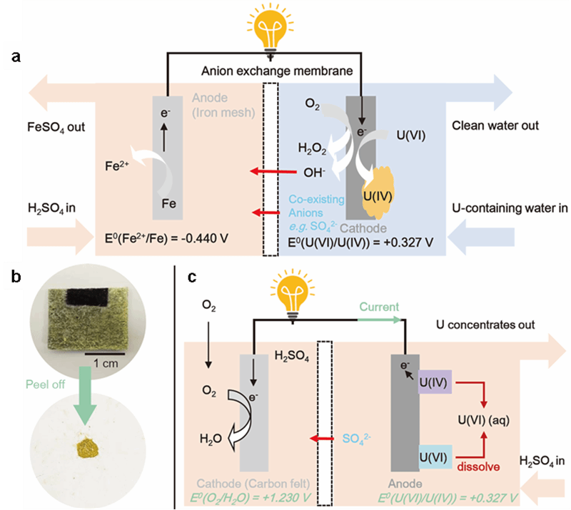 核能是清洁低碳、稳定高效的基荷能源,是实现“双碳”目标不可或缺的能源形式,而确保核燃料的环保开采和安全供给是核能可持续发展亟待解决的关键问题。铀作为重要的基础核燃料,其开采和提炼会产生大量的含铀废水,既造成铀资源的损失,又威胁生态环境安全。该成果针对传统吸附方法和零价铁诱导的还原沉淀方法处理铀矿废水存在的瓶颈问题,通过空间解耦铀吸附还原和铁氧化反应,研发了一种自驱动型废水电化学提铀及同步产电工艺(图1),实现了稳定、高效的铀提取,同时输出净电能。结合同步辐射等先进分析技术探明了铀与电极之间的互作过程,厘清了铀电化学还原沉积的关键环节和调控机制,为铀矿废水处理的碳减排与资源化开辟了新途径。该成果对于实现“双碳”目标、减少核能产业的负面环境影响以及缓解陆地铀资源的枯竭均具有重要意义。
