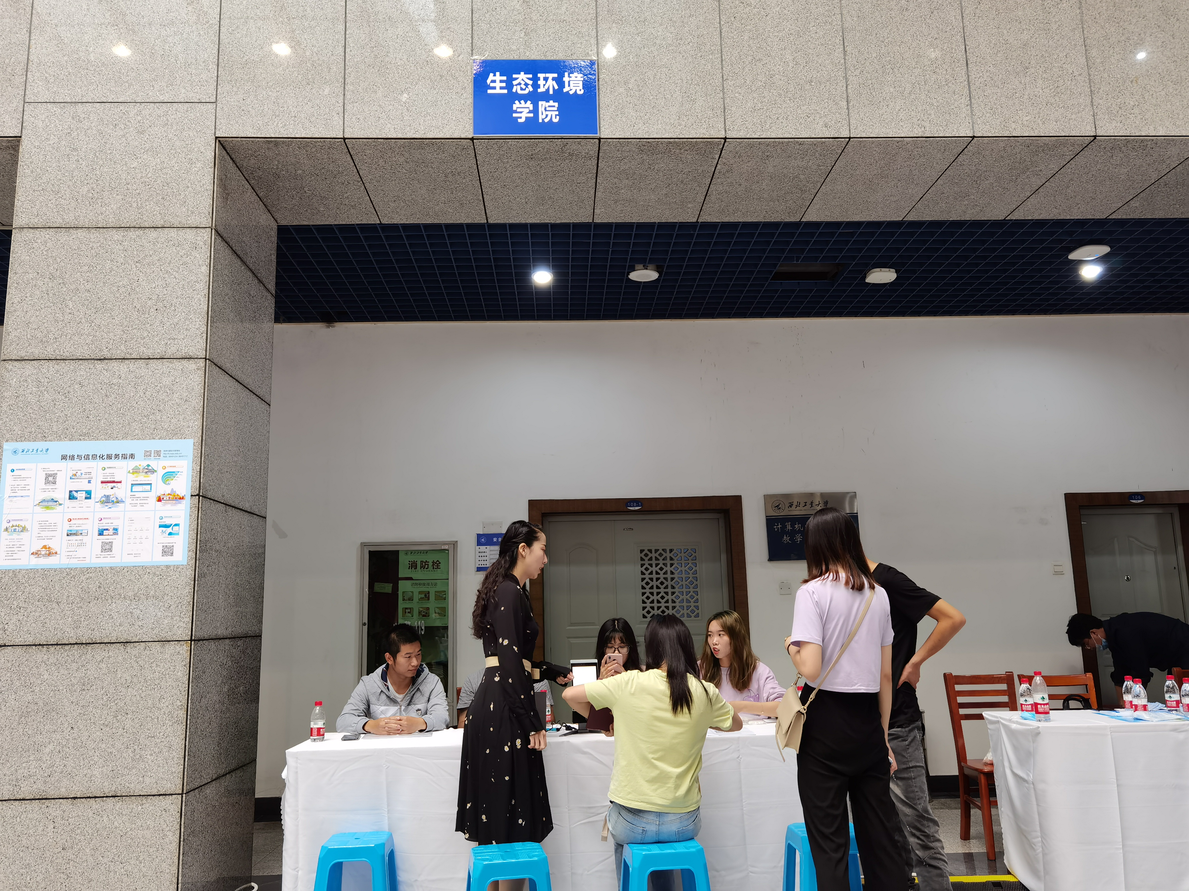 等;实验大楼内部接待由学院副书记(主持工作)牟蕾、副书记张永鑫带领5位学院志愿者提供服务,协助新生办理报道手续、发放一卡通、分发防疫物资、解答新生疑惑等。