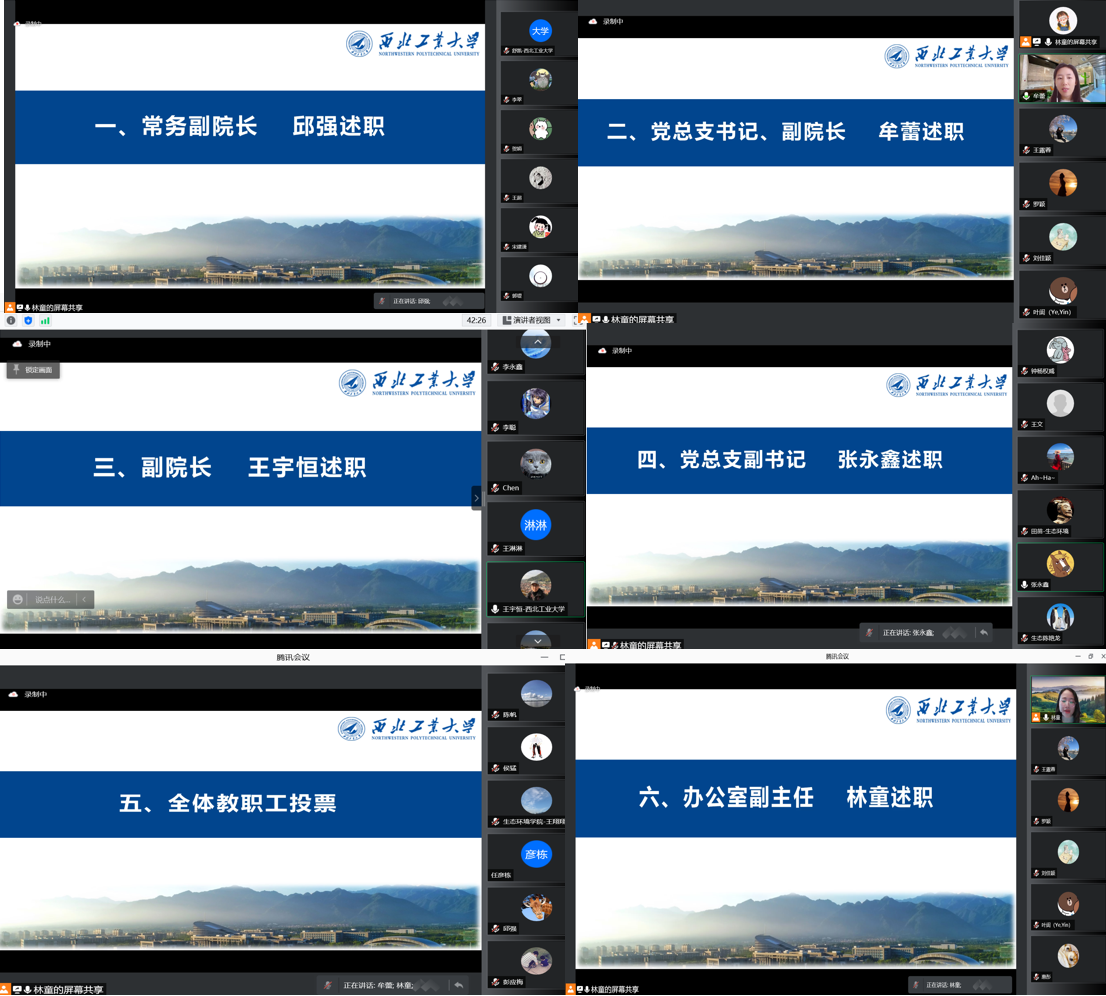 会议第二项,常务副院长(五级领导人员)邱强、党总支书记、副院长牟蕾、副院长王宇恒、党总支副书记张永鑫、办公室副主任林童依次围绕学习贯彻习近平新时代中国特色社会主义思想、党的十九大和十九届二中、三中、四中、五中、六中全会精神,贯彻落实上级部门和学校党委决策部署、依法履行岗位职责、完成重点工作情况,落实“一岗双责”、意识形态、党风廉政建设责任制及对领导班子成员开展监督、师德师风等情况,以及个人在德、能、勤、绩、廉等方面的表现情况,充分结合各自的分管工作进行述职汇报。随后,所有参会人员进行了测评投票。
