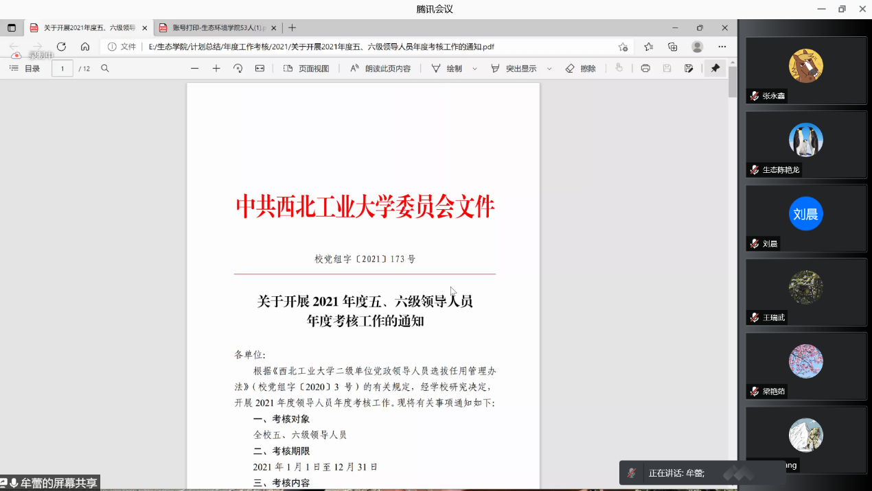 会议第一项,牟蕾同志带领全体参会人员学习了《关于开展2021年度五、六级领导人员年度考核工作的通知》(校党组字〔2021〕173号)文件精神,并向与会人员介绍评议规则。