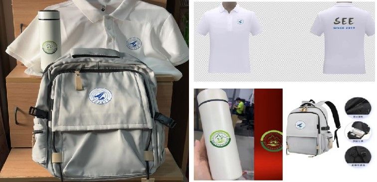 英文缩写,寓意学院教育的高远视野与广阔未来。灰白基调文创书包,以校徽为亮点,简约设计中满载对新生的深情厚望;而银灰色保温杯则点缀以动漫A片