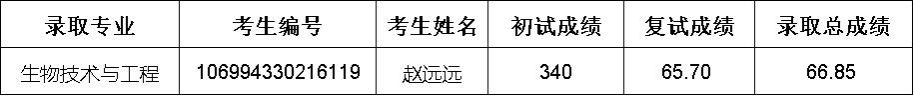 因有考生放弃录取,拟对生物技术与工程专业按照总成绩排序依次递补1名,公示如下:
