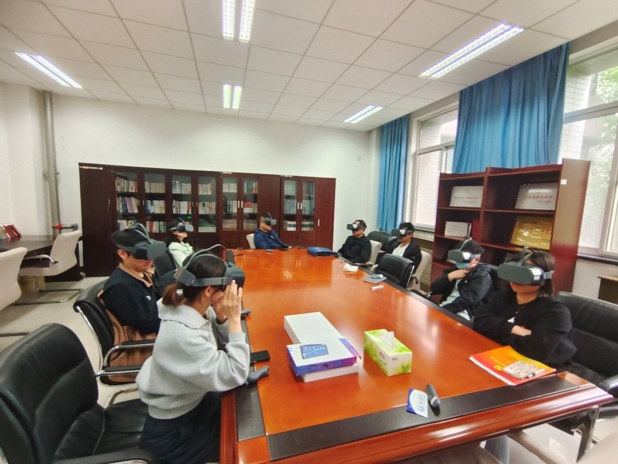 学习会后,学院一行赴马克思主义学院党建VR活动室,通过VR设备沉浸式体验学习了“延安革命纪念馆”等实景教学资料,进一步加深了对延安精神的理解与认识。