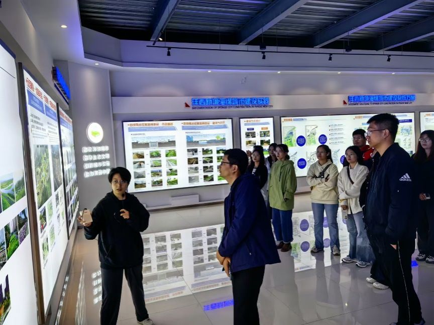 师生首先参观了海绵城市技术中心展厅,学习了海绵城市建设的核心理念、技术体系及实际应用案例;通过讲解员生动详细的讲解和实地观摩,大家深刻认识到海绵城市在应对城市水问题、改善城市生态环境方面的巨大潜力。师生们还参观了透水铺装、雨水花园、生态滞留池等多个海绵城市建设示范项目。
