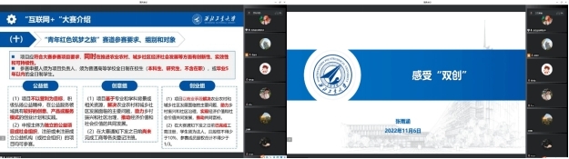 活动采用线上与线下结合的方式开始,邀请了学院在 “互联网+”和“三航杯”竞赛中获奖的张雨涵同学和杨惠淳同学为大家分享他们团队背后的“双创故事”,内容十分精彩。张雨涵介绍了国家对“双创”大赛的期望和要求以及参赛项目的选题,并结合自己参加“青年红色筑梦之旅”赛道谈一些感悟;杨惠淳讲述了他的研究课题与双创课题结合的故事,分享了他在参加第八届中国国际“互联网+”大学生创新创业大赛和动漫A片